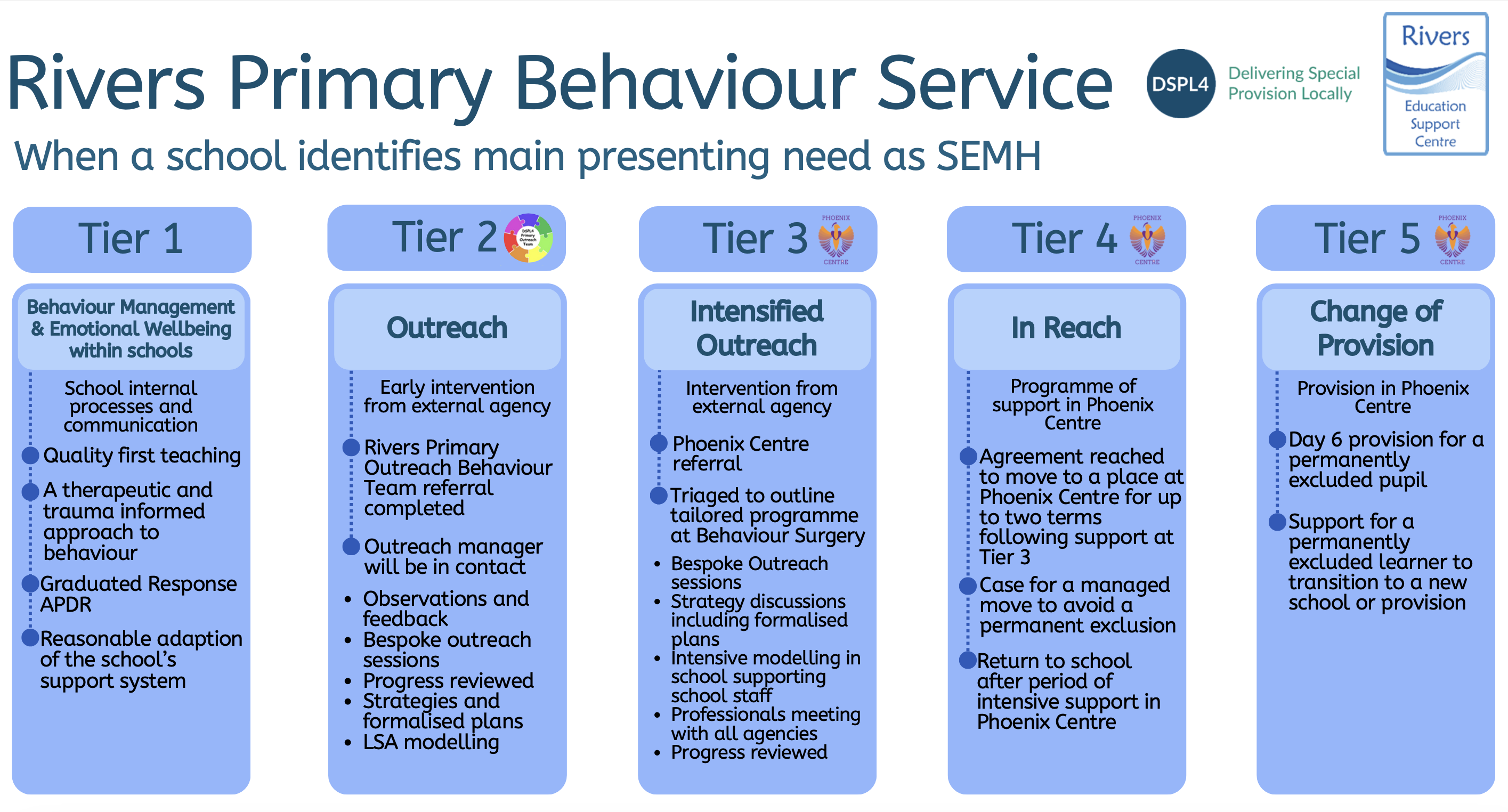 At DSPL4 we have developed a behaviour strategy in cohesion with Rivers ESC.   The strategy defines the tiered approach to SEMH and behaviour support that we offer in the area.  More information about our Primary Behaviour Service can be found here.  Details and referral information for our Secondary Behaviour Service can be found here.